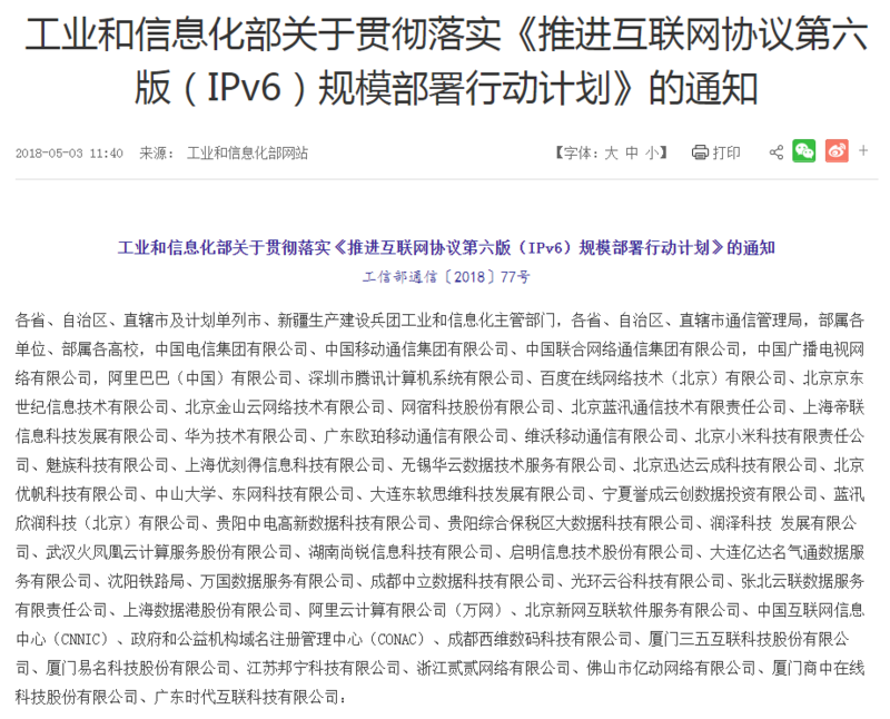 根據(jù)中辦、國辦下發(fā)的《行動(dòng)計(jì)劃》和工信部下發(fā)的《通知》:2018年末,省級(jí)政府網(wǎng)站,央企網(wǎng)站和新聞媒體網(wǎng)站全部改造支持IPv6;2020年末,市級(jí)政府和新聞媒體和工業(yè)互聯(lián)網(wǎng)應(yīng)用支持IPv6。...