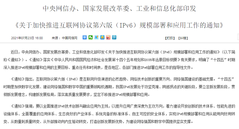近日,中央網(wǎng)信辦、國家發(fā)展改革委、工業(yè)和信息化部印發(fā)《關(guān)于加快推進(jìn)互聯(lián)網(wǎng)協(xié)議第六版(IPv6)規(guī)模部署和應(yīng)用工作的通知》(以下簡稱《通知》)。《通知》落實(shí)《中華人民共和國國民經(jīng)濟(jì)和社會(huì)發(fā)展第十四個(gè)五年規(guī)劃和2035年遠(yuǎn)景目標(biāo)綱要》有關(guān)要求,明確了“十四五”時(shí)期深入推進(jìn)IPv6規(guī)模部署和應(yīng)用的主要目標(biāo)、重點(diǎn)任務(wù)和時(shí)間表,是各地區(qū)、各部門推進(jìn)IPv6部署應(yīng)用工作的指導(dǎo)性文件?!锻ㄖ分赋觯ヂ?lián)網(wǎng)協(xié)議第...