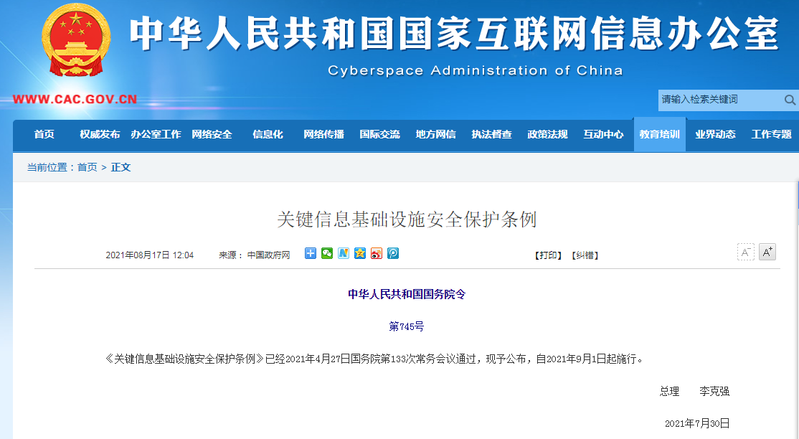 中華人民共和國國務(wù)院令第745號(hào)《關(guān)鍵信息基礎(chǔ)設(shè)施安全保護(hù)條例》已經(jīng)2021年4月27日國務(wù)院第133次常務(wù)會(huì)議通過,現(xiàn)予公布,自2021年9月1日起施行??偫怼 ±羁藦?qiáng)2021年7月30日關(guān)鍵信息基礎(chǔ)設(shè)施安全保護(hù)條例第一章 總 則第一條 為了保障關(guān)鍵信息基礎(chǔ)設(shè)施安全,維護(hù)網(wǎng)絡(luò)安全,根據(jù)《中華人民共和國網(wǎng)絡(luò)安全法》,制定本條例。第二條 本條例所稱關(guān)鍵信息基礎(chǔ)設(shè)施,是指公共通信和信息服務(wù)、能源、交...